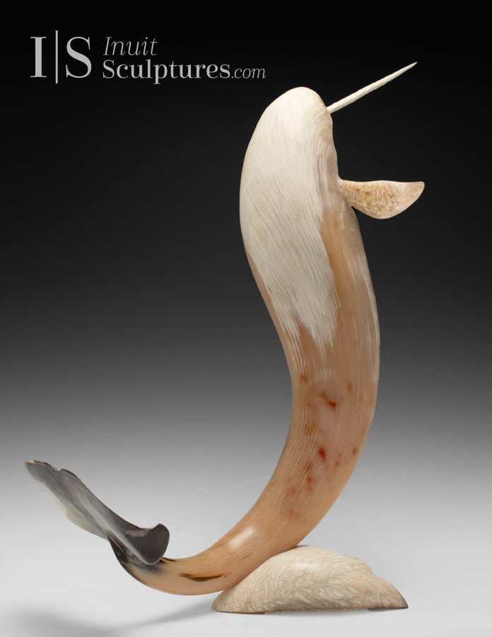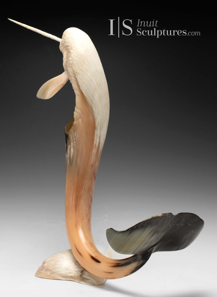Paul Malliki has transformed the horn of a muskox into a regal, wave riding Narwhal.