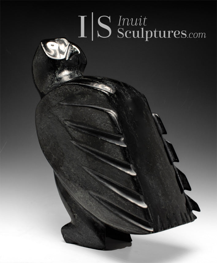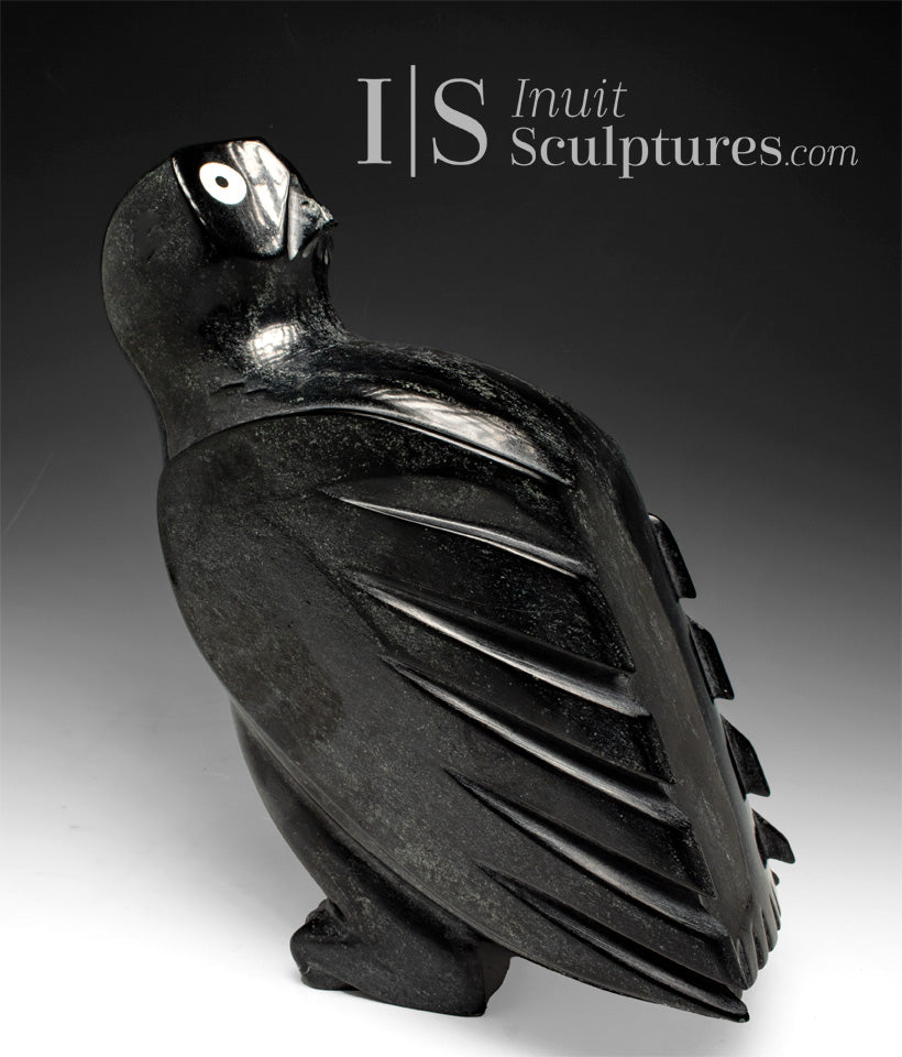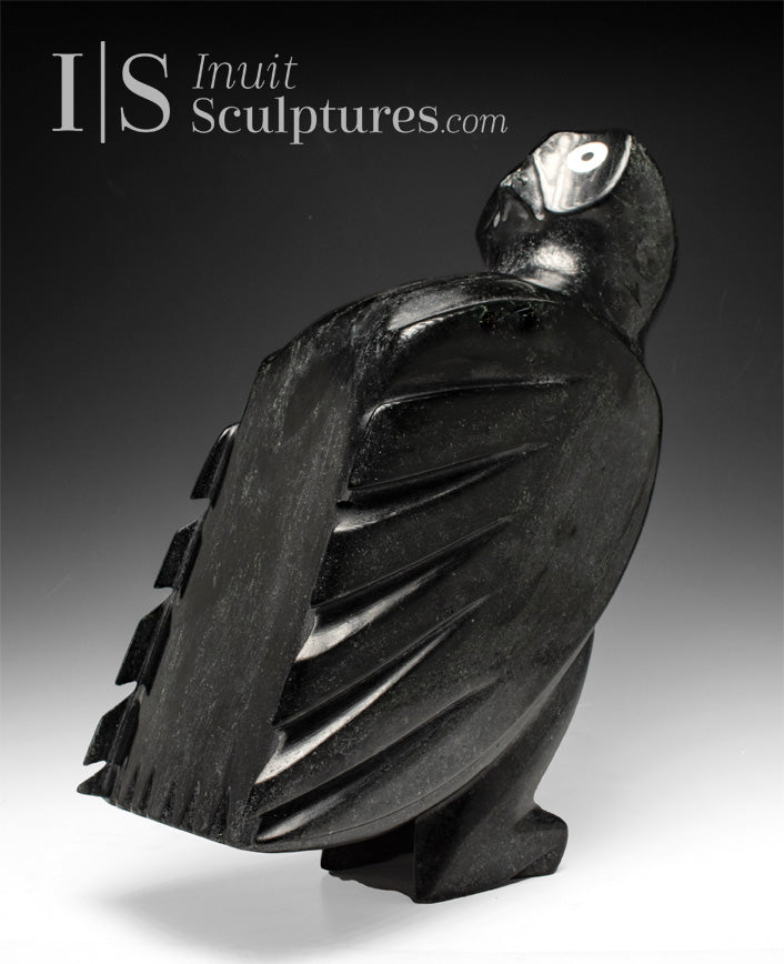 The majority of Inuit Owl carvings have large sturdy feet, large inlaid eyes, are geometric in their style, and have a prominent beak.