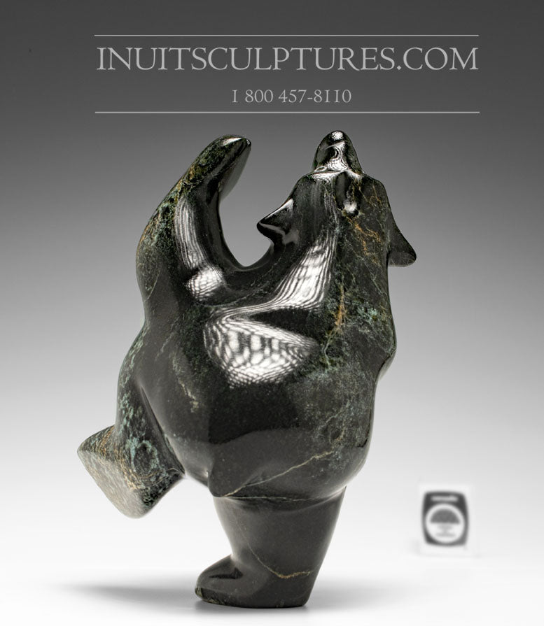 Ottokie Samayualie takes great care in choosing his stone. His carvings are made of the finest serpentine of varying green shades, and then smoothed and polished to best exhibit the lustre of the stone.