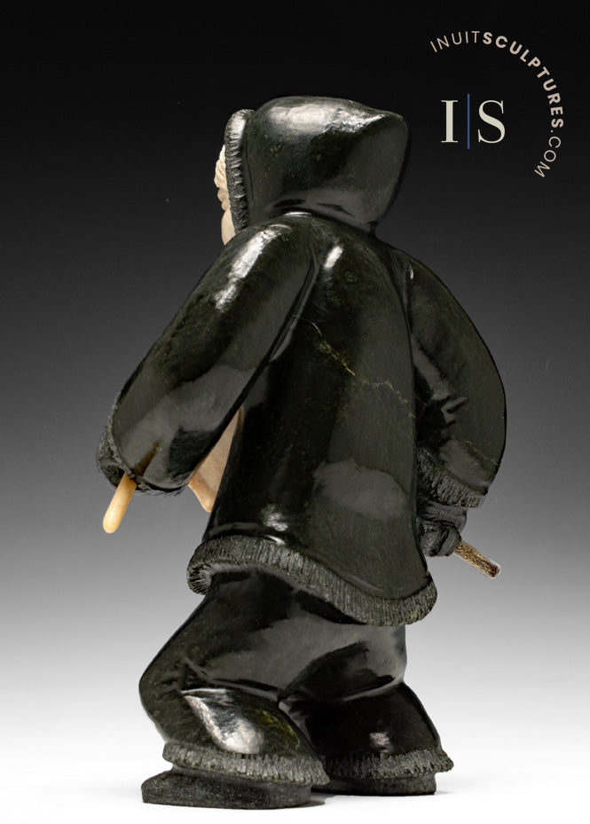 It would be so simple for the artist to present the piece with a more primitive face but instead, Dale has taken the extra time to carve a face that describes the emotions the Inuk is feeling as he bangs his drum.