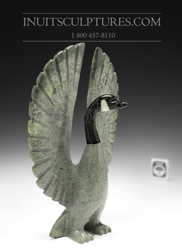 This is an outstanding proud standing Canada goose from Cape Dorset directly from Johnysa Mathewsie. What is so special about this carving is that the proportions are exceptional and the detail and lines are as crisp as you will ever see in a perfectly made sculpture.