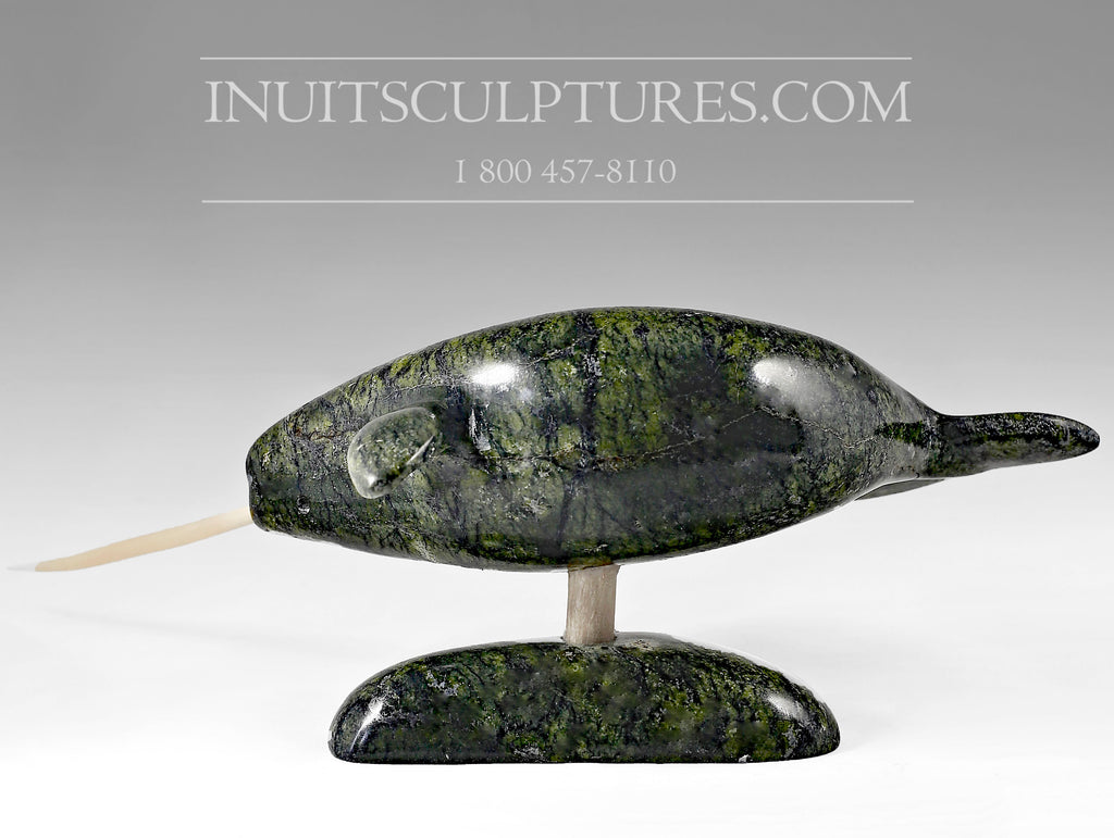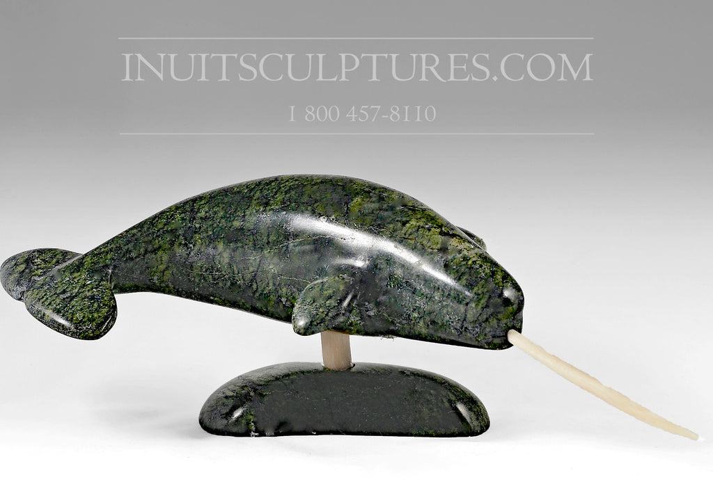 This is a beautiful rendition of a swimming Narwhal by Louis Uttaq. Powerful creatures of the Arctic sea, this piece is elevated on an antler allowing the viewer to observe his power and might as it speeds through the water like lightening.