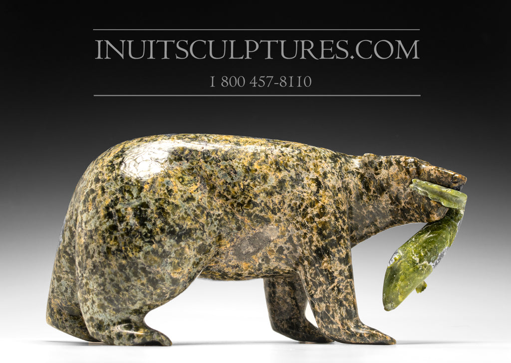 “Walking bear with fish” is an authentic Inuit carving which is signed on the bottom by Lyta Josephie.