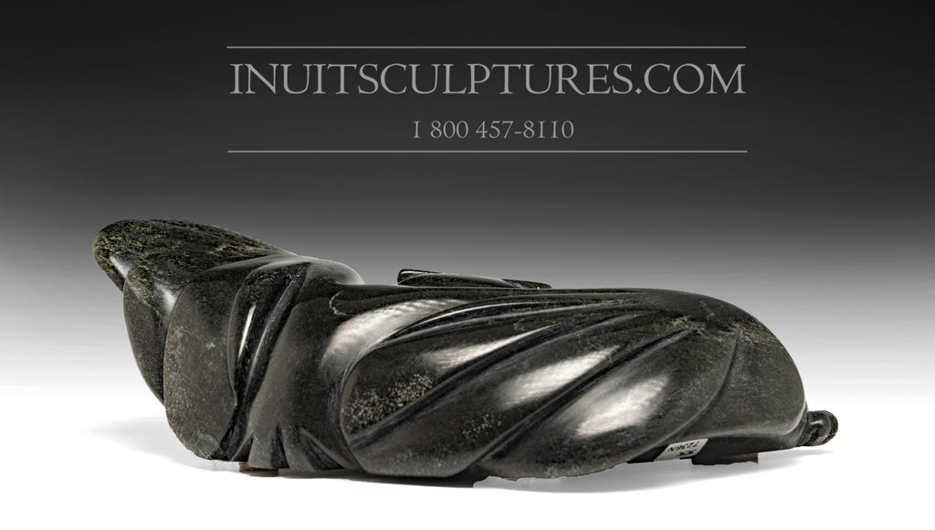 The eyes made from caribou antler blend exquisitely with the dark serpentine stone. The carving is polished to a mirror shine with beautiful proportions and lines throughout.