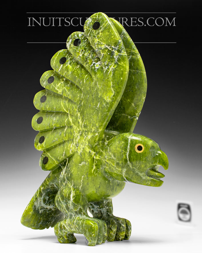 "Toonoo's parents, Josephee Sharky and Ragee Killiktee, were both carvers, though he credits his grandfather, master carver Kuppapik Ragee and his uncle Shorty Killiktee as influences. Toonoo started carving at ten, began to get serious at thirteen and first exhibited when he was just 17. He is regarded as one of the most exciting young carvers to emerge in the Arctic. His themes include fanciful and quite dramatic treatment of wildlife, particularly birds, and transformational works that are both powerful and humorous. His work is widely shown, and he was elected to the Royal Canadian Academy in 2003." *