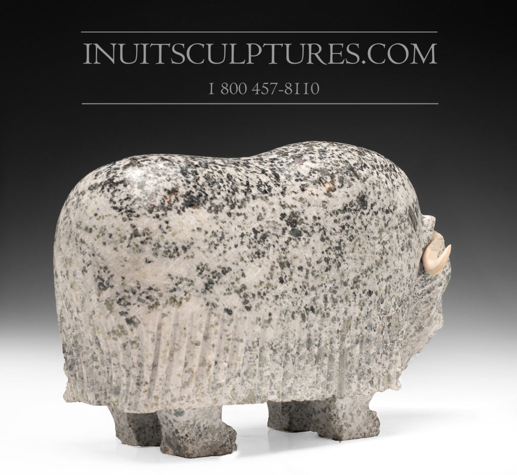 Killiktee honours this deep bond to the muskox in this carving. The deep rich speckled stone glows in the light. Each strand of hair on the underbelly and the back fringe is meticulously and patiently chiselled with obvious care.