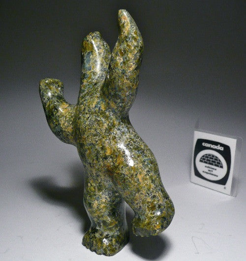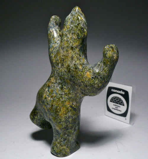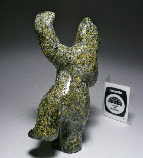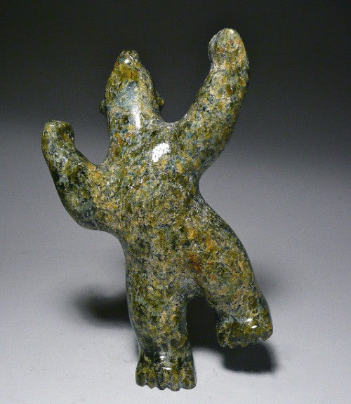 This is a beautiful traditional green speckled colored dancing bear by Tony Oqutaq. The green coloring is warm and gentle, which is why I like it. traditional colored carvings are very much in demand because they radiate that warm feeling.