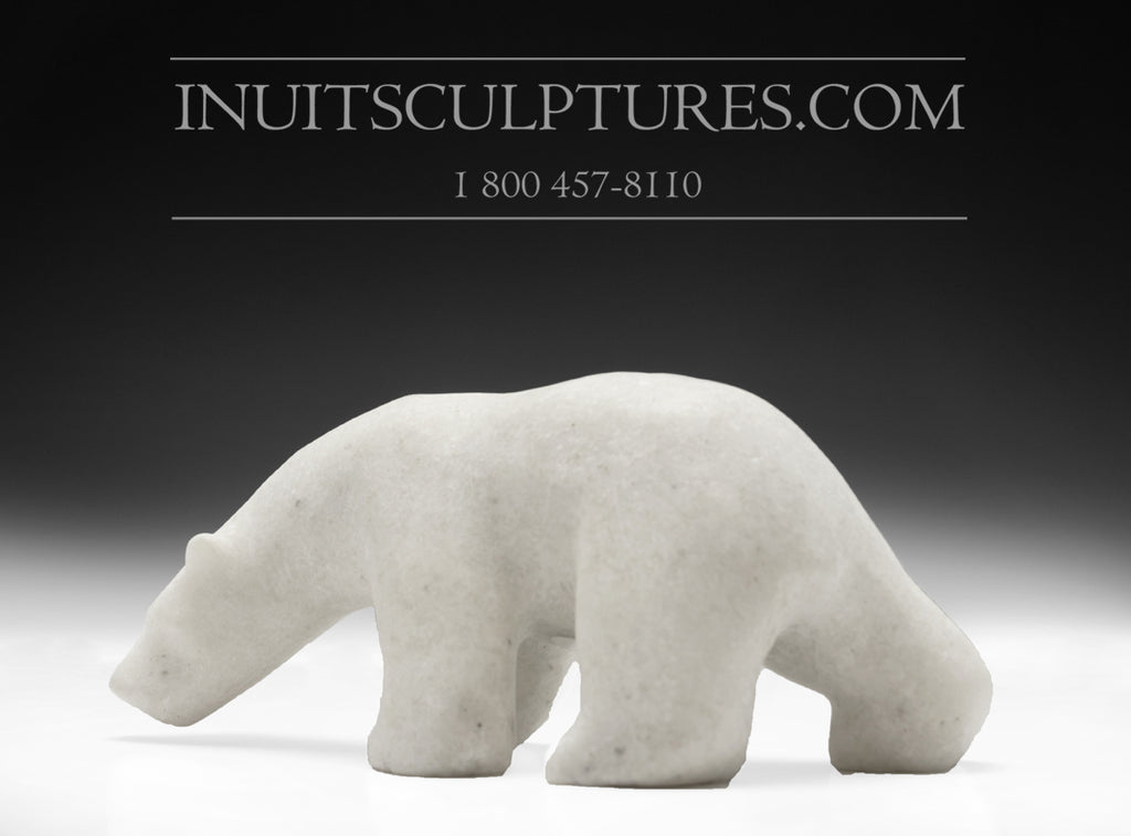 This is a beautiful traditional marble scenting bear by Tony Oqutaq. The colouring is electric, which is why we liked it. This bear has a wonderful pose as it is sniffing. The movement is gorgeous and was made by a very reputable inuit artist. Tony is known for his scenting bears. The movements he creates are subtle and very life like.