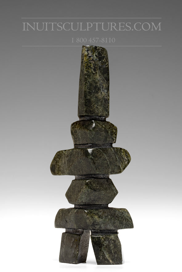 This is a gorgeous balanced Inukshuk done in a striking serpentine stone from Cape Dorset. The curves are exceptional The refined stone adds a beautiful clash between modernism and traditional style. Polished to a mirror shine.