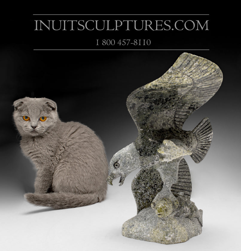 This sculpture is an extremely rare eagle with fish presented by Canada’s most recognized Inuit artist, Pitseolak (Pits) Qimirpik from Kimmirut. Pits is among three elite Inuit artists in Canada who have won international status. His carvings are found in Canada’s national art collection in Ottawa and in exhibitions around the world.