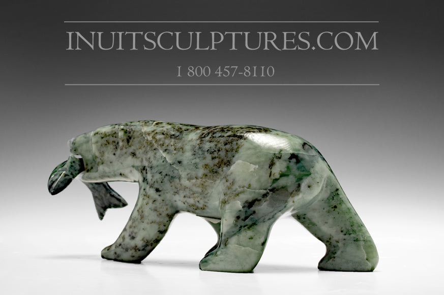 This is a gorgeous carving depicting a bear in its natural habitat. This bear is gracefully carved in the actions of catching a salmon fish. This is a very rare find and Sheutiapik is the only artist who carves this subject as it is hard to carve both a bear and fish together.
