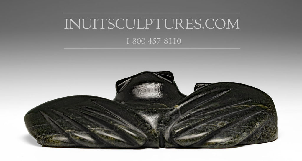 The eyes made from caribou antler blend exquisitely with the dark serpentine stone. The carving is polished to a mirror shine with beautiful proportions and lines throughout.