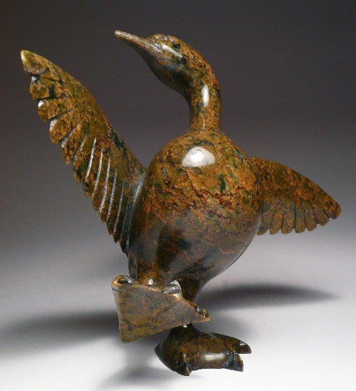 Pudlalik Shaa makes beautiful masterpiece birds. His dancing gooses are his signature theme. The proportions to his pieces are always perfect and well balanced. What I especially admire about his pieces are the stylized curvatures and colors he uses. The heads of his birds are very beautiful.