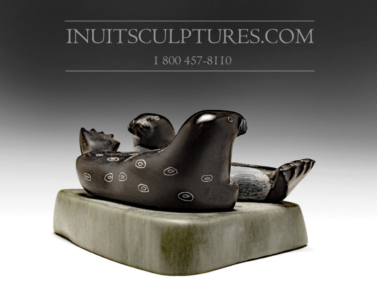 What caught my eye is the jet black coloration used for the stone. I also particularly like the heads of the two seals as well as the etching mark spots on the back. Josie Iqaluq is well known for his playful fun loving seals. They make wonderful gifts for weddings or anniversaries as they convey peace and harmony. It is very symmetrical and round with a gorgeous smooth finish to it. A property among Sanikiluaq art which makes it so famous.