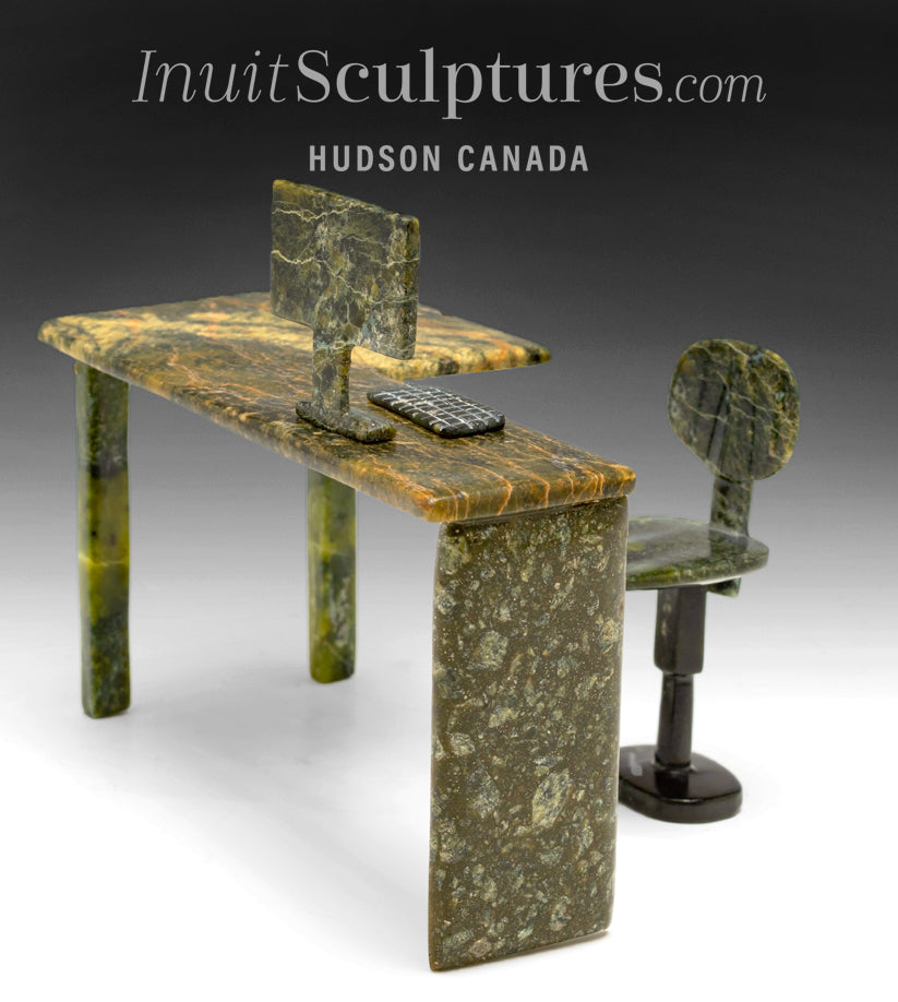 Ning and James Pitseolak are close cousins. They often carve together. The adaptation of this contemporary desk is inspired by James Pitseolak's utilitarian objects that he would carve. Both artists often carved together, and it is understood that the "Office Desk" was inspired by many of James's pieces over the years.