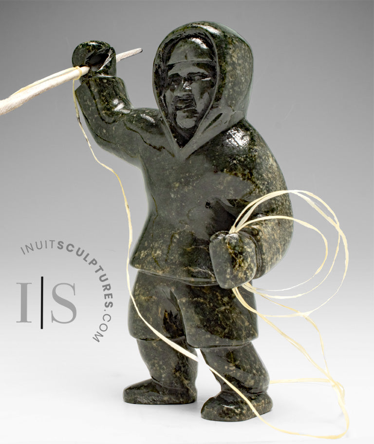 Our stoic Inuk stands quietly and motionless with his harpoon raised over his head (rope attached).