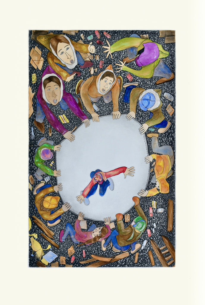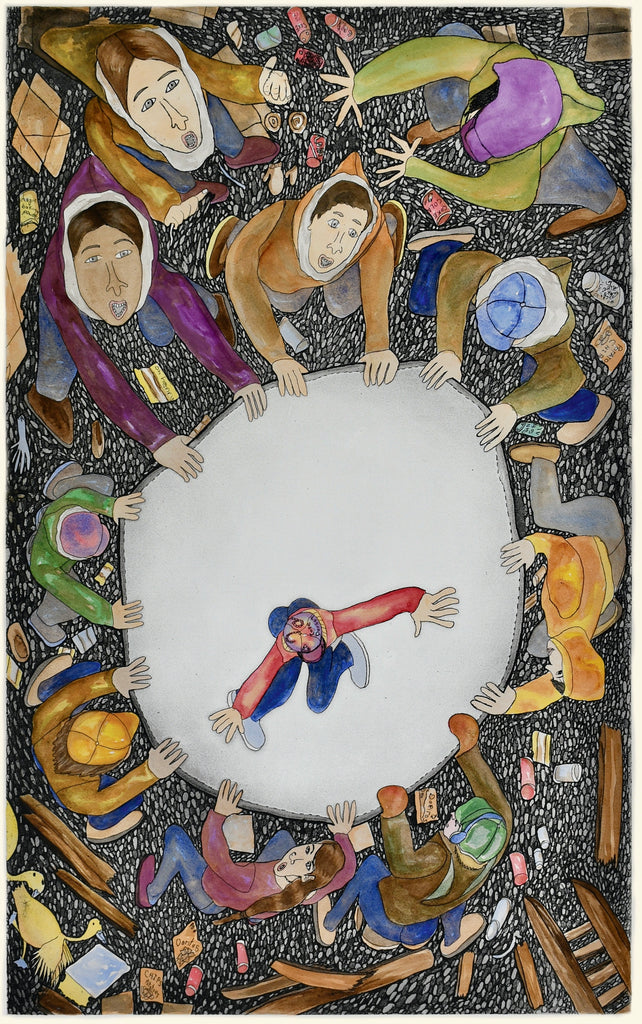Shuvinai Ashoona, RCA, born 1961 in Kinngait, Nunavut, is a renowned Inuit artist celebrated for her intricate drawings and prints that blend the stark realities of contemporary Arctic life with surreal, fantastical elements. Her pieces often feature detailed landscapes, hybrid figures, and motifs that merge traditional Inuit symbols (like ulus and kudliks) with modern influences, creating a unique visual narrative that explores identity, environment, and imagination.