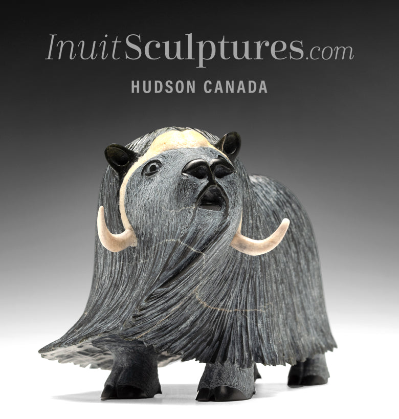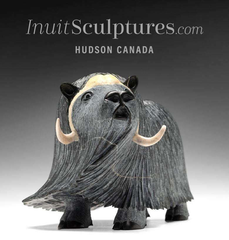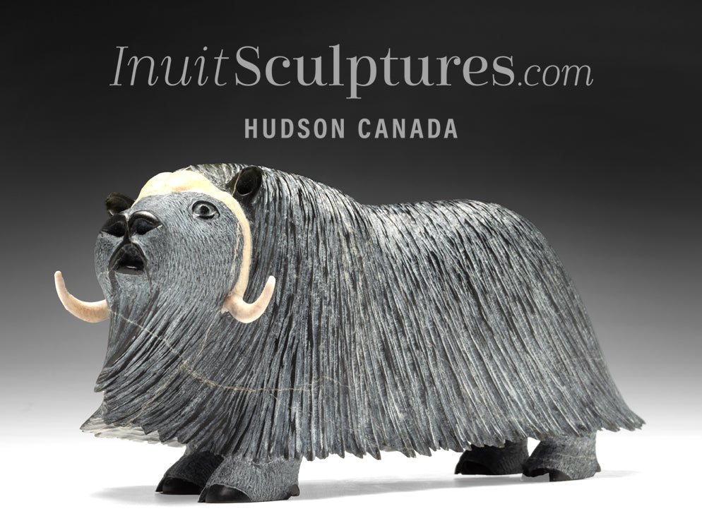 ** Lucassie carves only a few Muskox carvings per year. Carving stone causes many chronic health problems like chronic lung disease, severe arthritis, and chronic rotator cuff tears. It is not surprising that our senior Carvers become less able to carve as the years go by. Lucassie's Muskox sculptures are internationally recognized as his signature carvings.