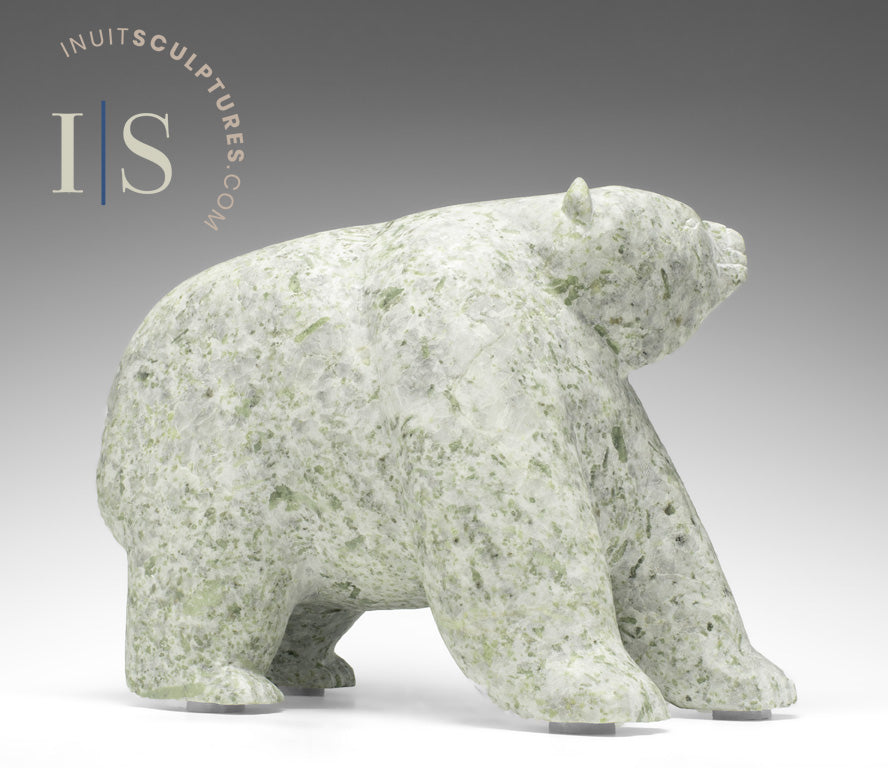 Finally, Kolola has sculpted this walking bear with a spectacular and somewhat unusual speckled green, gray and creamy white stone.