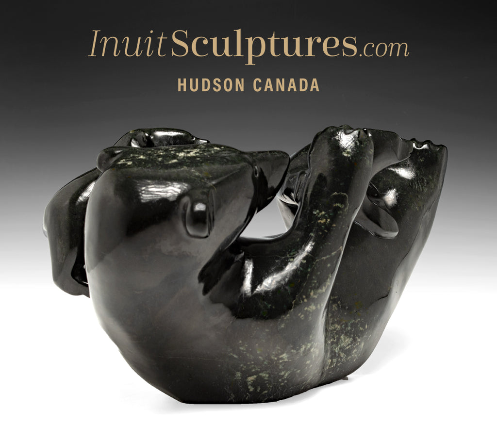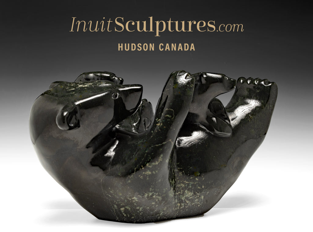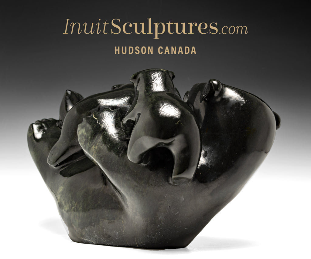 In this sublime setting of electric black marble stone, Ottokie Aningminuq has carved  an exquisite mother and bear cubs.