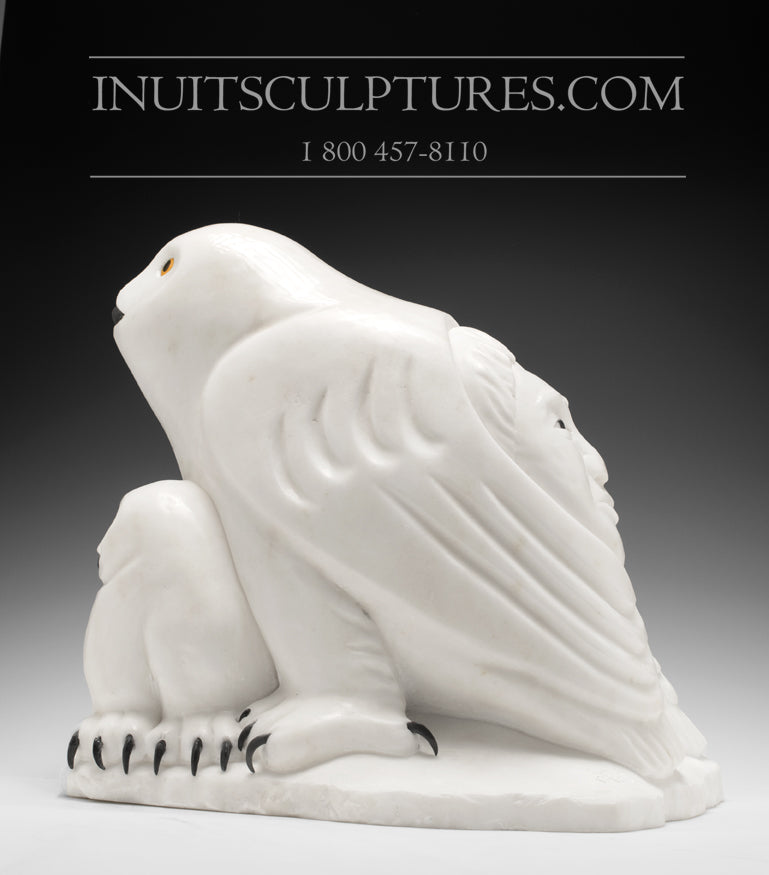 Over the past twelve years in my role of Curator of Inuit Sculptures, Manasie has consistently presented me with sophisticated premier sculptures.  Just when I think he couldn’t get better, he raises the bar and the result is a sculpture that takes my breath away.  This owl family is one of those pieces!