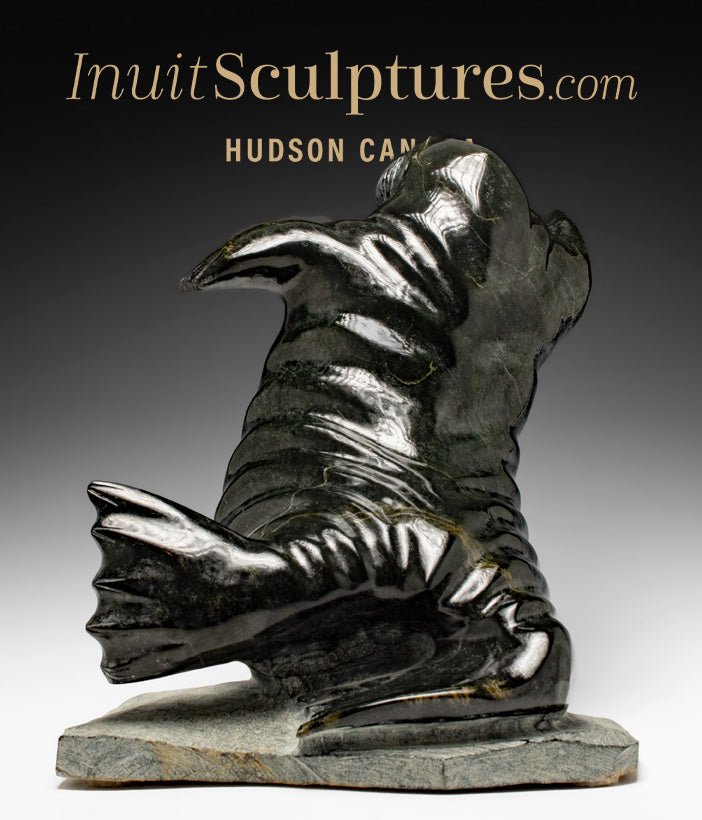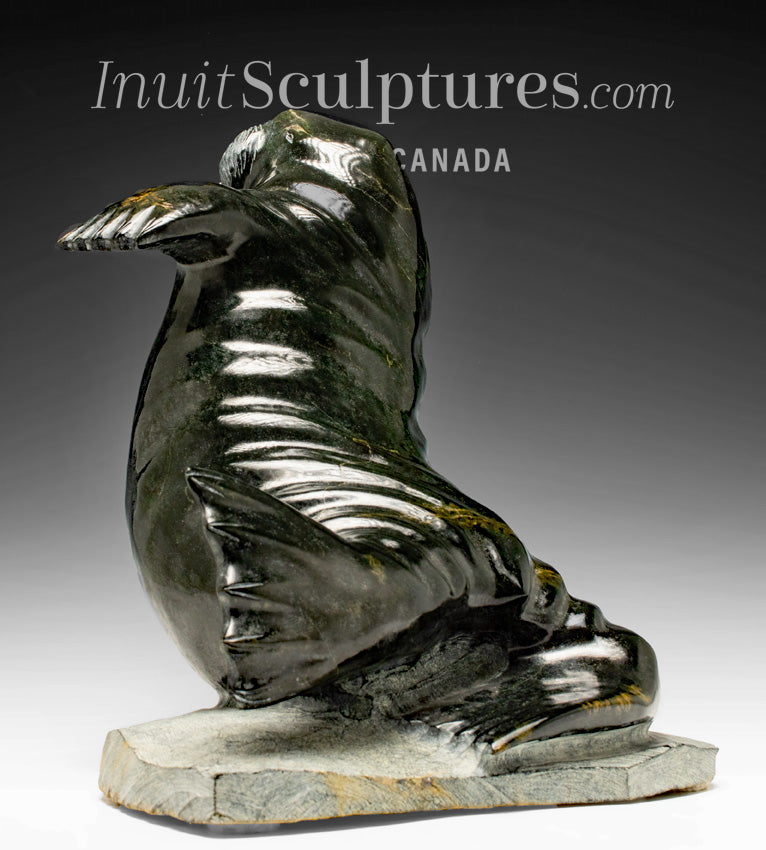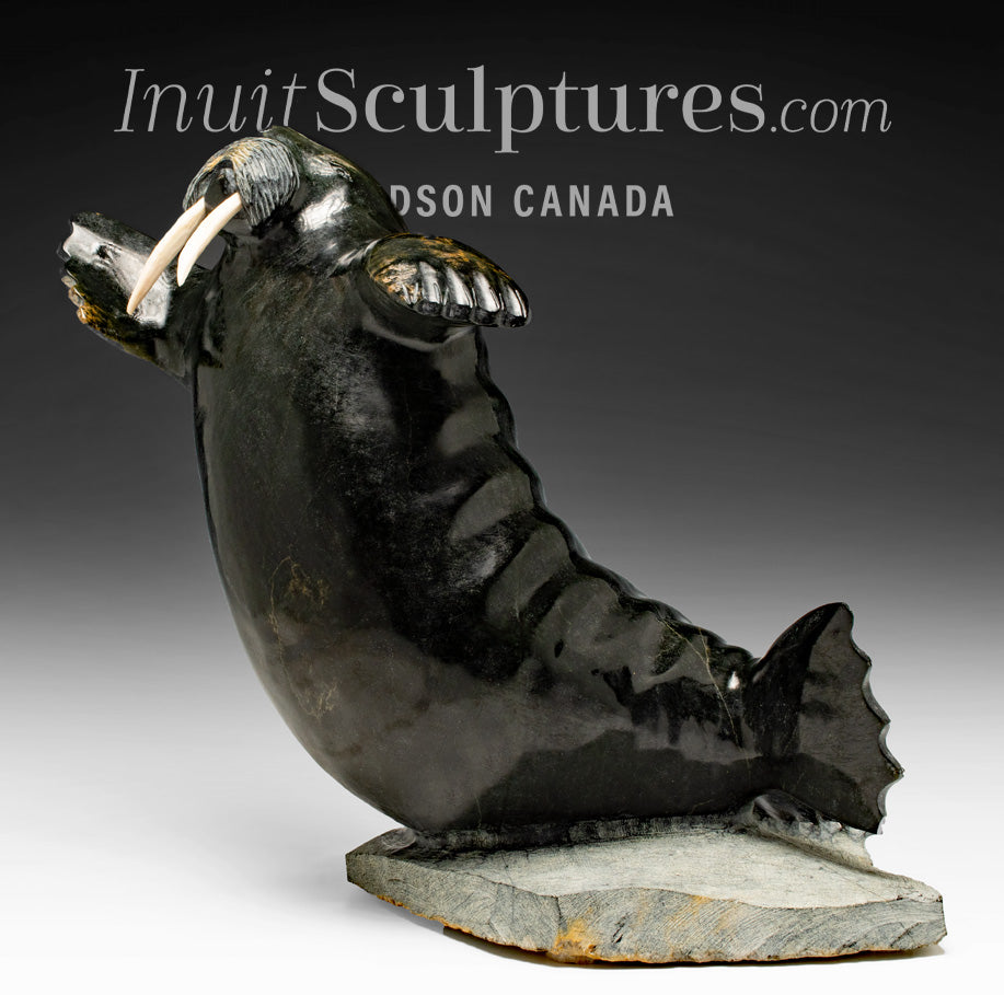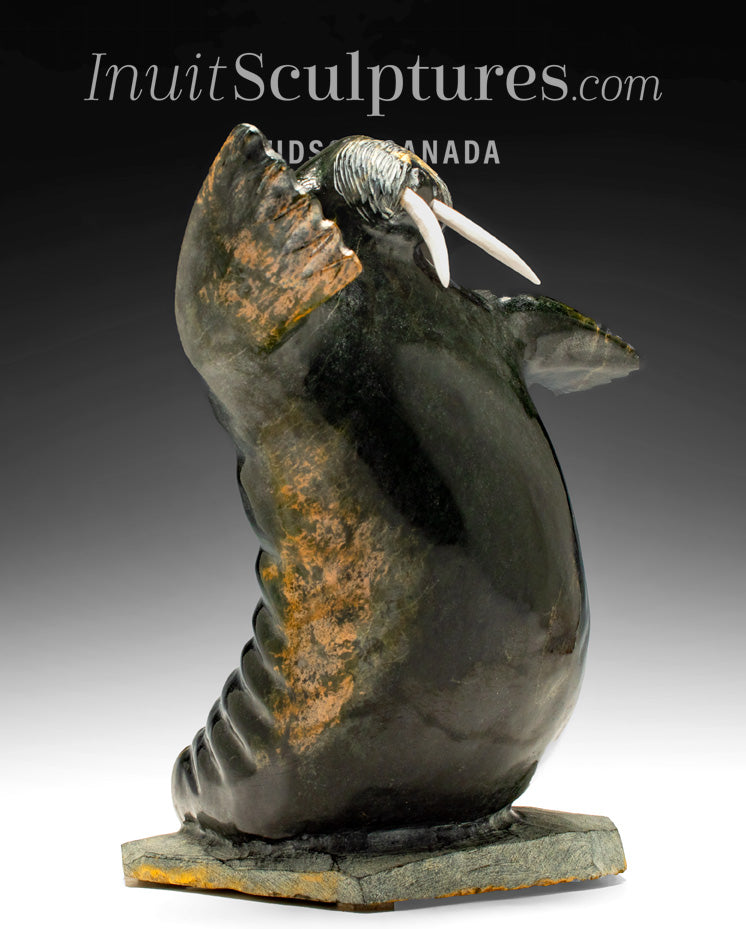 World renowned carver Jimmy Iqaluq loves to use a deep medium green colour stone for his rippled walruses.  He also likes to create a deep red coloured eye for his carvings.