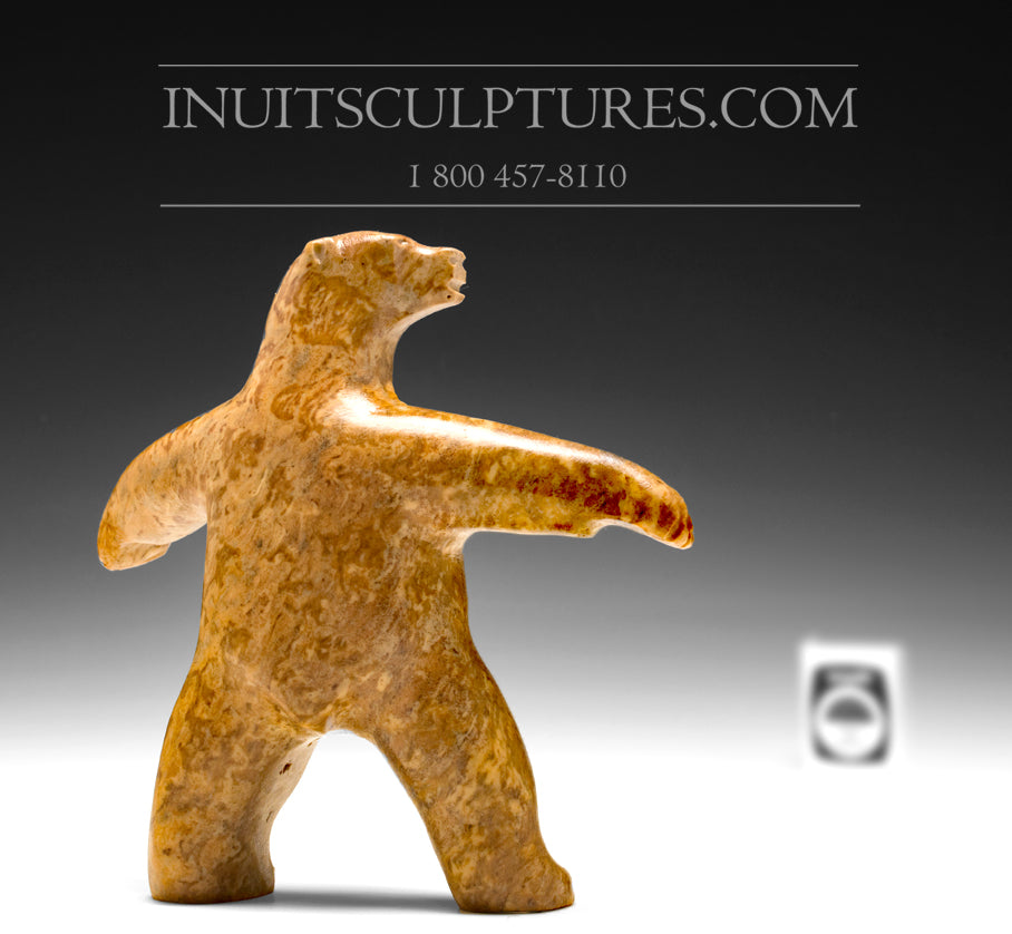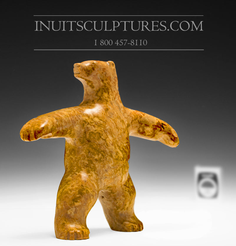Louie Uttaq has chosen an exquisite orange pekoe coloured stone for his charming standing bear. The bear is standing with arms and legs spread wide apart, inviting all aggressors to “step up to the plate”.