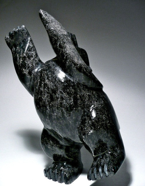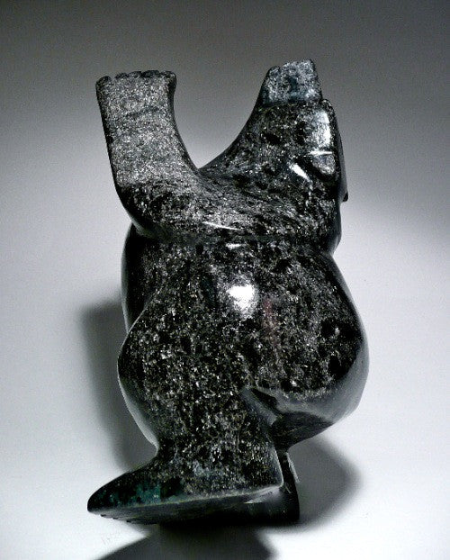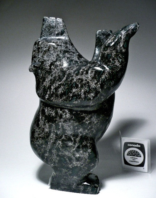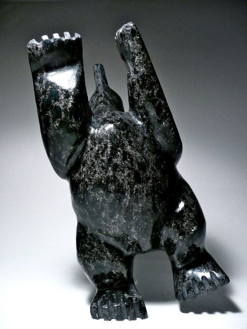 This is a beautifully carved dark colored dancing bear made from Mosesee Pootoogook in Cape Dorset, Nunuvut. It is quite large and chubby. The dark shiny serpentine stone creates a dramatic effect that makes it very noticeable to an audience. The movement and balance are exquisitely captivating.