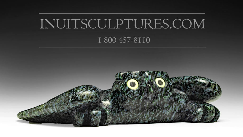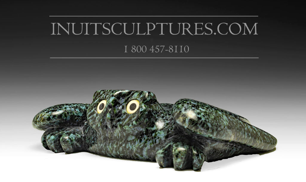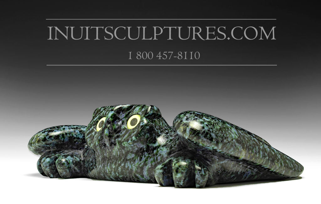 The inlayed eyes are Manning's raison d'etre and contribution to the Inuit art world. There is no artist that has mastered this gruelling technique quite like Manning. Fitting them into the stone takes much experience and skill. It is the eye catching colors of the eyes that bring his pieces to life.
