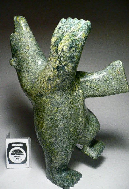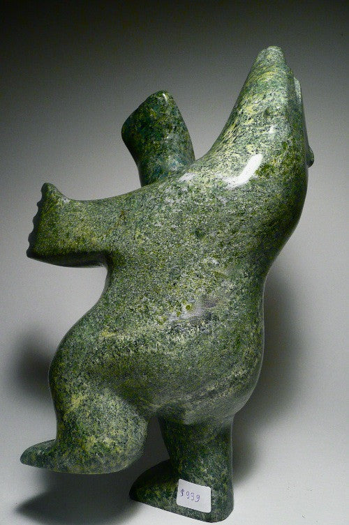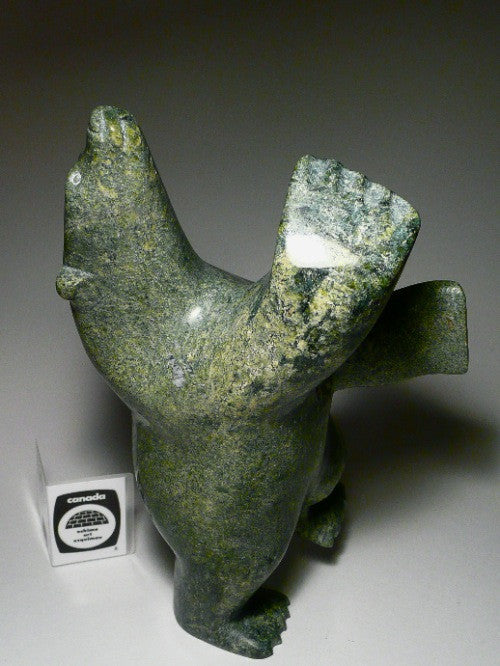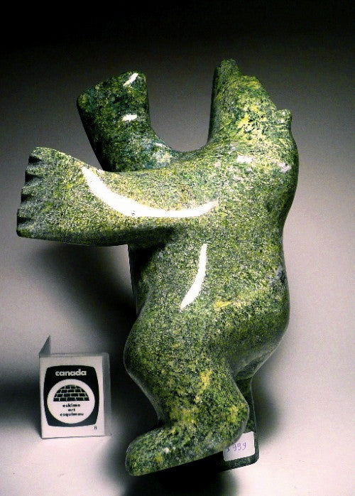 Joanie Ragee is a very well established artist and is recognized internationally for his dancing bears. His dancing bears are full of life with much movement. This is what attracts Inuit art enthusiasts to his works. Joanie Ragee prefers to carve using stone with the traditional green and grey coloration. He expresses himself mostly by allowing his dancing bears to balance perfectly while dancing on one or both legs.