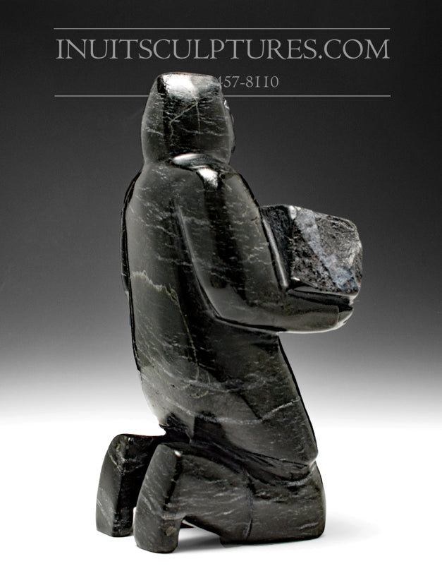The carving is stoic and opulent.  The dark stone is uplifted by the terse lines and flawless symmetry of the sculpture. This Masterpiece howls with bountiful audacity and sashay.  The facial features are permanently etched with joy reflecting the soul of this Eskimo carver.