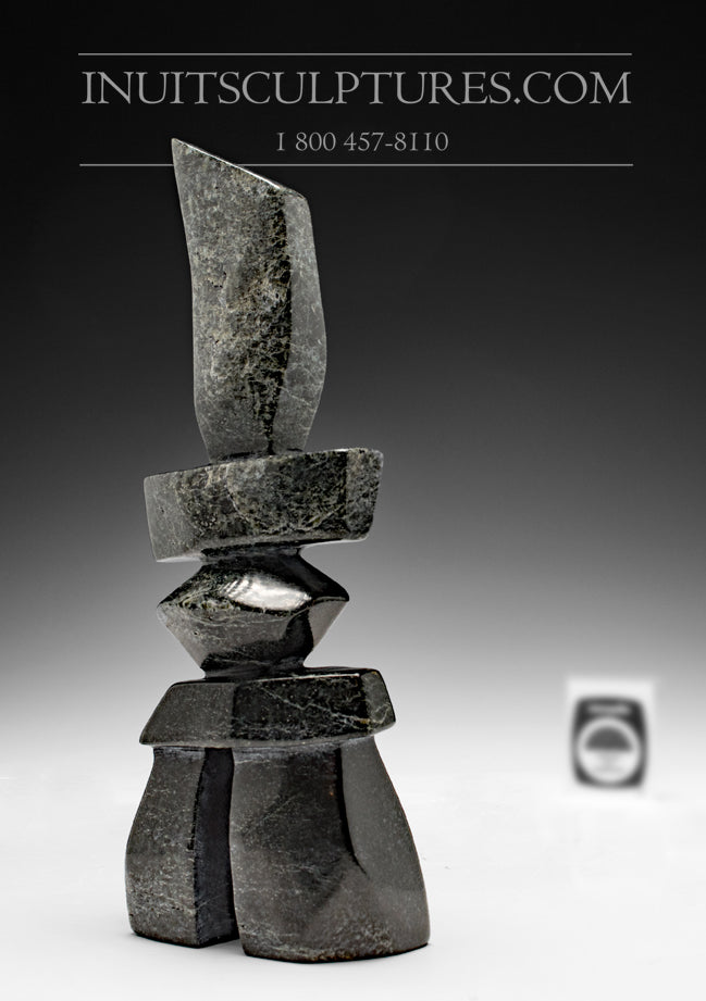 This is a gorgeous balanced Inukshuk done in a striking serpentine stone from Cape Dorset. The curves are exceptional The refined stone adds a beautiful clash between modernism and traditional style. Polished to a mirror shine.