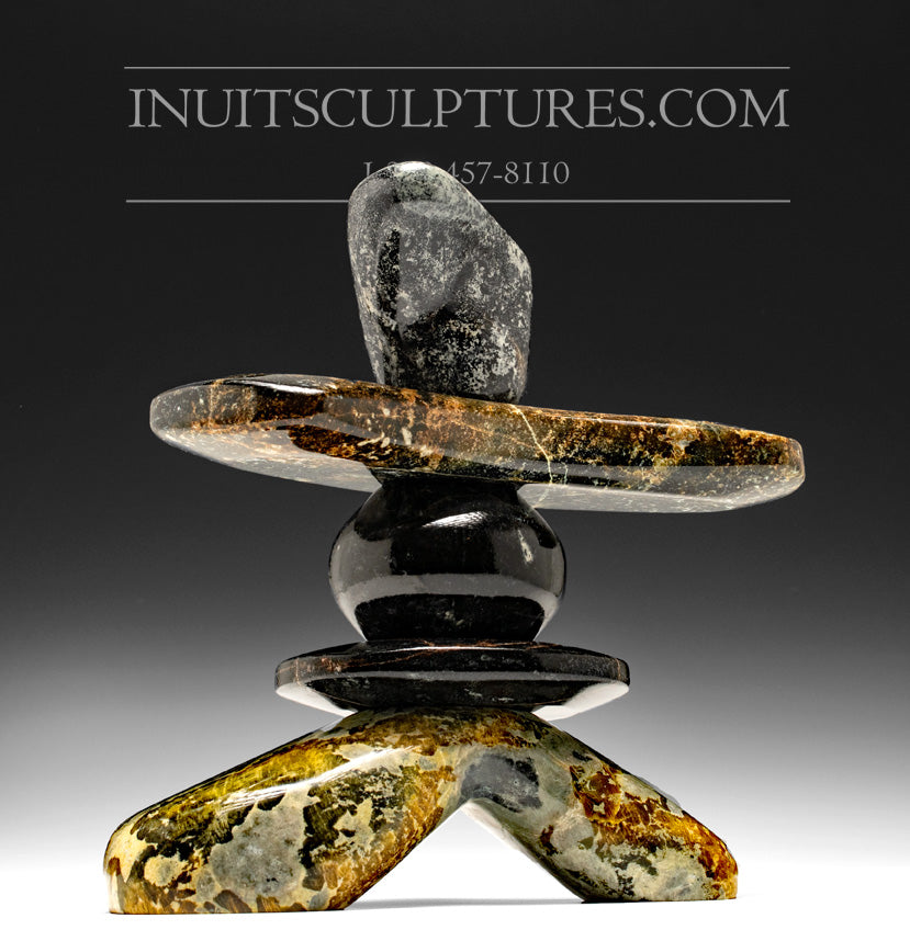 This is a gorgeously balanced inukshuk done in a striking serpentine stone. It has multiple colorations in the stone. The animation of Paul's Inukshuks are what really makes them stand out from all other Inukshuks.