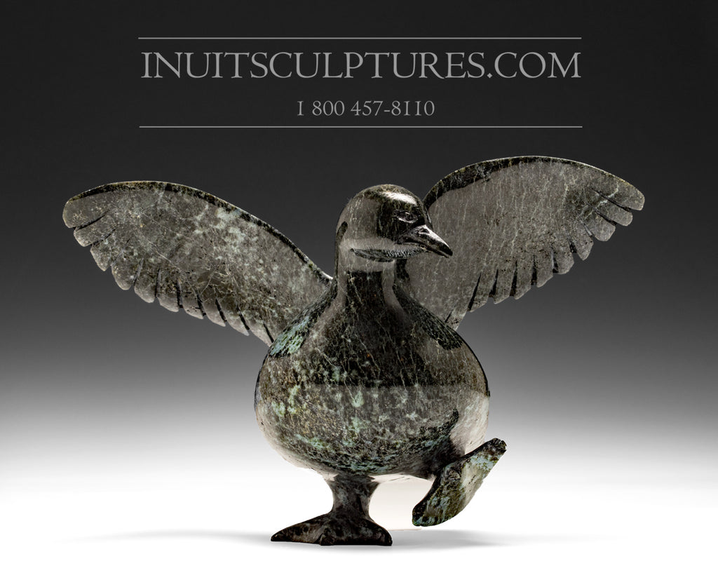 In many cases, the stone that plays as significant of a part as the art itself. This particular serpentine stone used for this magnificent Goose is deep and dark, highlighted with turquoise camouflage. Absolutely striking! Something that we don't often get to see in Serpentine stone. It is what illuminates the piece to another level.