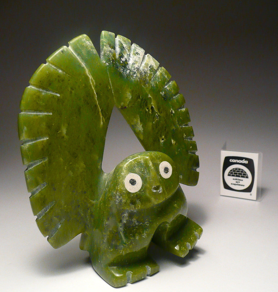 This is a gorgeous apple green owl created by Adamie Quamagiaq from Cape Dorset, Nunvut. Adamie likes to focus his works on owls. His owls are so distinguishable that you can tell immediately that it is by him.