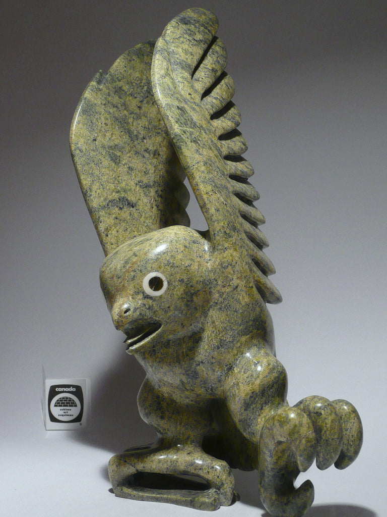 This is an outstanding owl by famous Toonoo Sharky from Cape Dorset. This beautiful owl is new. This Inuit art masterpiece is BIG, it measures 14" tall, 8.5" wide. It is made out of serpentine.