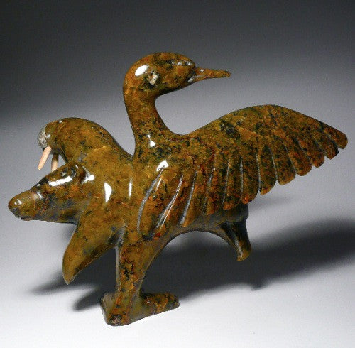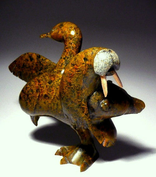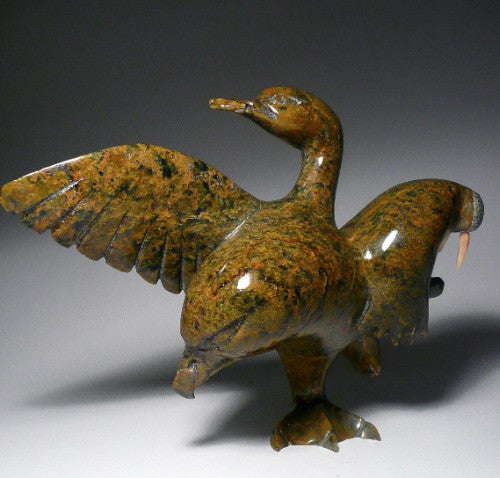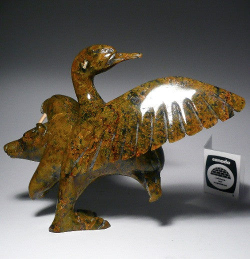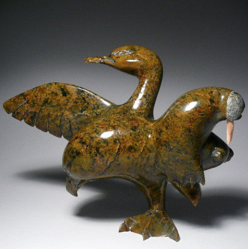 This is a gorgeous transformation dancing goose by master Inuit carver Pudlalik Shaa from Cape Dorset. This dancing goose measures 7" wide, 5.75" tall. It is made out of serpentine.