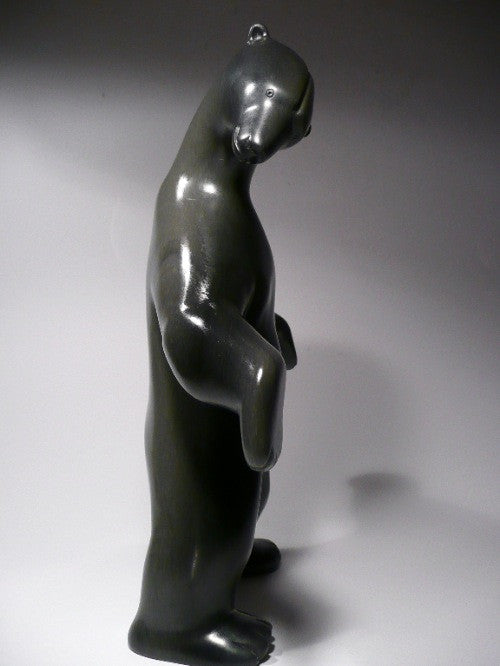 This graceful bear is one of the nicest dancing bears I have ever seen. The arms and hands have a fluid flow to them that give it an unparalleled grace like never seen before in a carving. It has a beautiful refined finish to it. The argillite stone has a beautiful dark smooth texture consisting of beautiful wavy grains sweeping against the stone. The proportions are superbly done and the subject is very harmonistic in nature. This carving resonates joy and happiness as well as a pinch of sophistication.