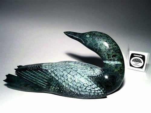 Etulu Etilodie is world famous for his loons. Any loons by him are unmistakenably his own. The beautiful etch marks he puts for the feathers are extraordinary. The style of loons he makes, all have a certain grace to them. They are eloquently refined with beautiful proportions and a smooth surface. Etulu's loons have been on the world centre stage and have been part of many international inuit exposes. This is why his loons are so sought after.