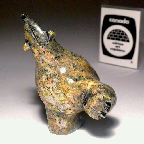 This is a beautiful brown dancing bear by the acclaimed Inuit artist Moe Petooloosie. This exquisite dancing bear was acquired directly from his hands in Iqaluit (arctic Canada).